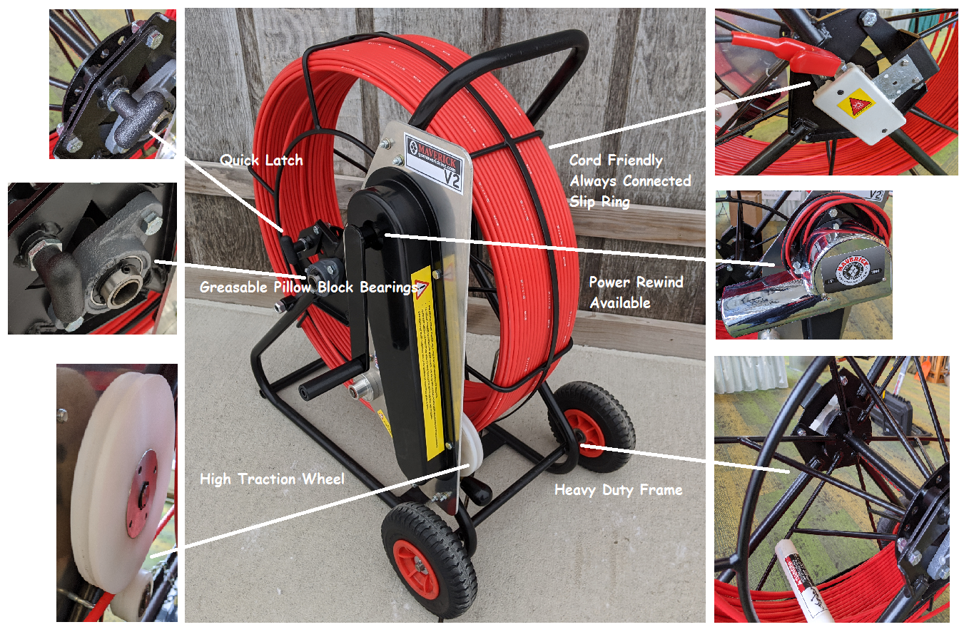 …is very simple to use. The reel is used for locating the route of underground duct, plastic pipes or clay tiles. This makes it an excellent tool for maintenance and repair of field tile networks. It contains various length of various sizes of rod that is rigid, yet flexible enough to guide into nonmetallic and metallic pipes that are over 1” in diameter. There is a terminal connection and a tension brake on the “V2’ & “MAX” for slowing down or stopping reel rotation.